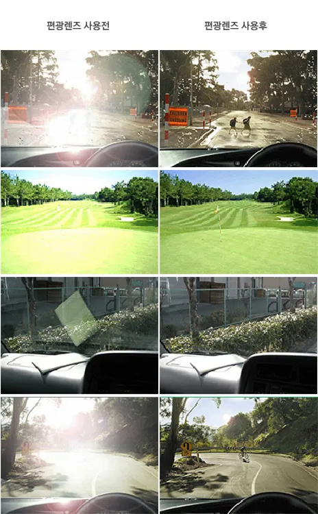 장점 요약: 반사광 억제, 대비감 향상, 눈 피로 감소, 윤곽 명확화, 역광·젖은 노면 적응력 상승.